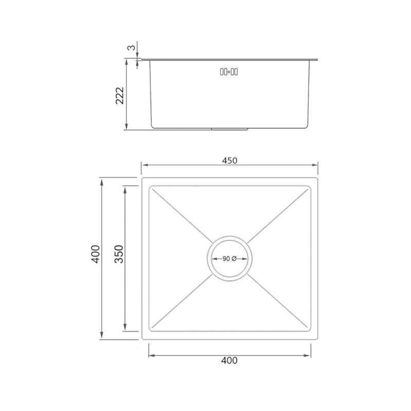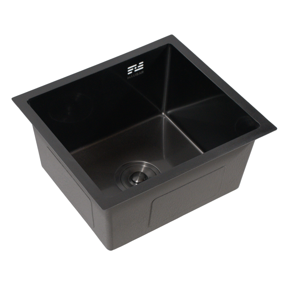 Bacha de cocina con bordes simétricos y profundidad extra Tipo de acero: Inoxidable AISI304 Medidas externas: 600x450x220 mm — Internas: 550×400 mm Acabado: Black-Nano (PVD) Colocación: Bajo, sobre o al ras